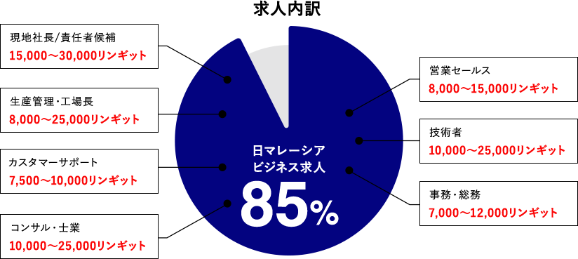 「マレーシア⇔日本」ビジネスに特化しているため、マレーシア勤務や日本勤務(マレーシア出張や駐在・出向有り)の求人が85%以上。