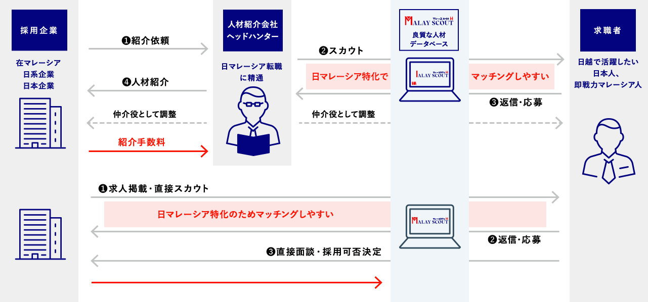 マレーシアスカウトは、「求人サイト」と「人材紹介会社/ヘッドハンター」の双方の特徴を併せ持つ、日マレーシア間(日本 ⇔ マレーシア)の転職に焦点を当てた独自の転職プラットフォームです。本サービスは、「日マレーシア」転職に限定することで、利用者と採用企業、そしてヘッドハンターとの間で高精度なマッチングを可能にしています。企業側は掲載する求人へのアクセスを、会員登録者のみに制限する設定も選択できます。加えて、一般的な職種だけでなく、マネジメント層や専門職といった上級ポジションの求人も豊富に用意されており、リーズナブルかつ成功報酬ベースのシステムにより、企業が求人を出しやすい仕組みを整えています。